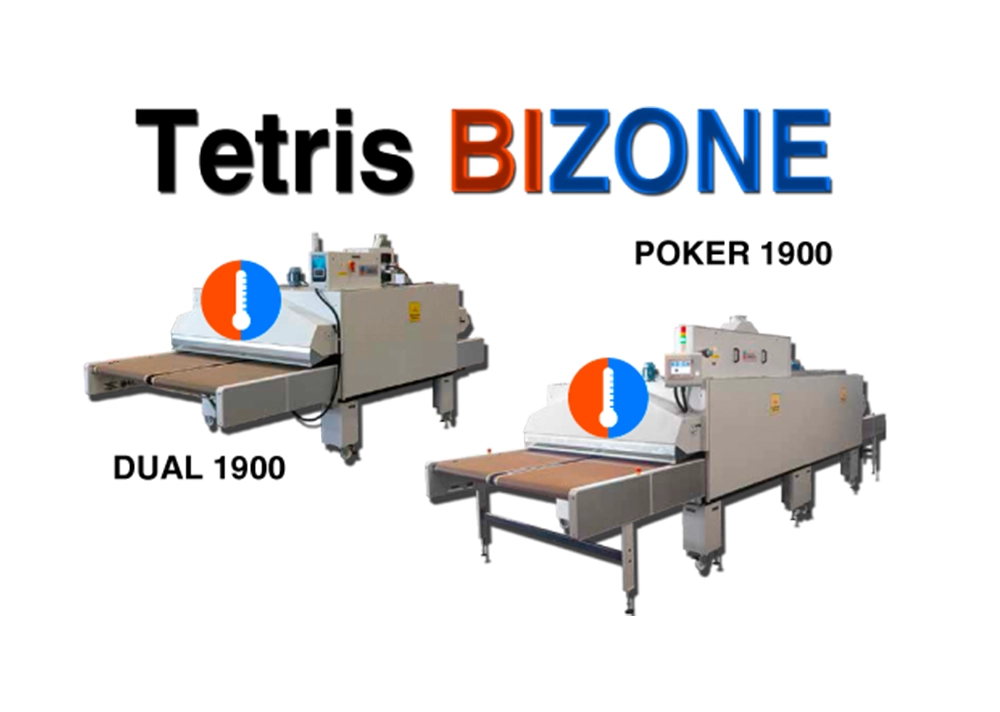 La plataforma TETRIS 1900 se ha dividido en dos módulos 950 independientes: esto dará como resultado tener 2 secadoras con el espacio ocupado por 1. Disponible solo en DUAL 1900 y POKER 1900. Producción (5 minutos de tiempo de secado) 440 piezas/h